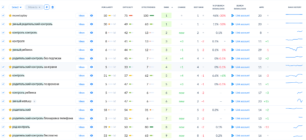 Вот как, например, выглядит график популярности приложения в Google Play по запросам – 1 место уверенно держит бренд и “умный родительский контроль”, на 5-ое место забрался “контроль”. И мы видим, как уверенно мы провели ASO – оптимизацию под поиск в Google Play. “Подхватились” и ползут вверх позиции по куче релевантных запросов (хотя среди них есть и искусственные от Google).